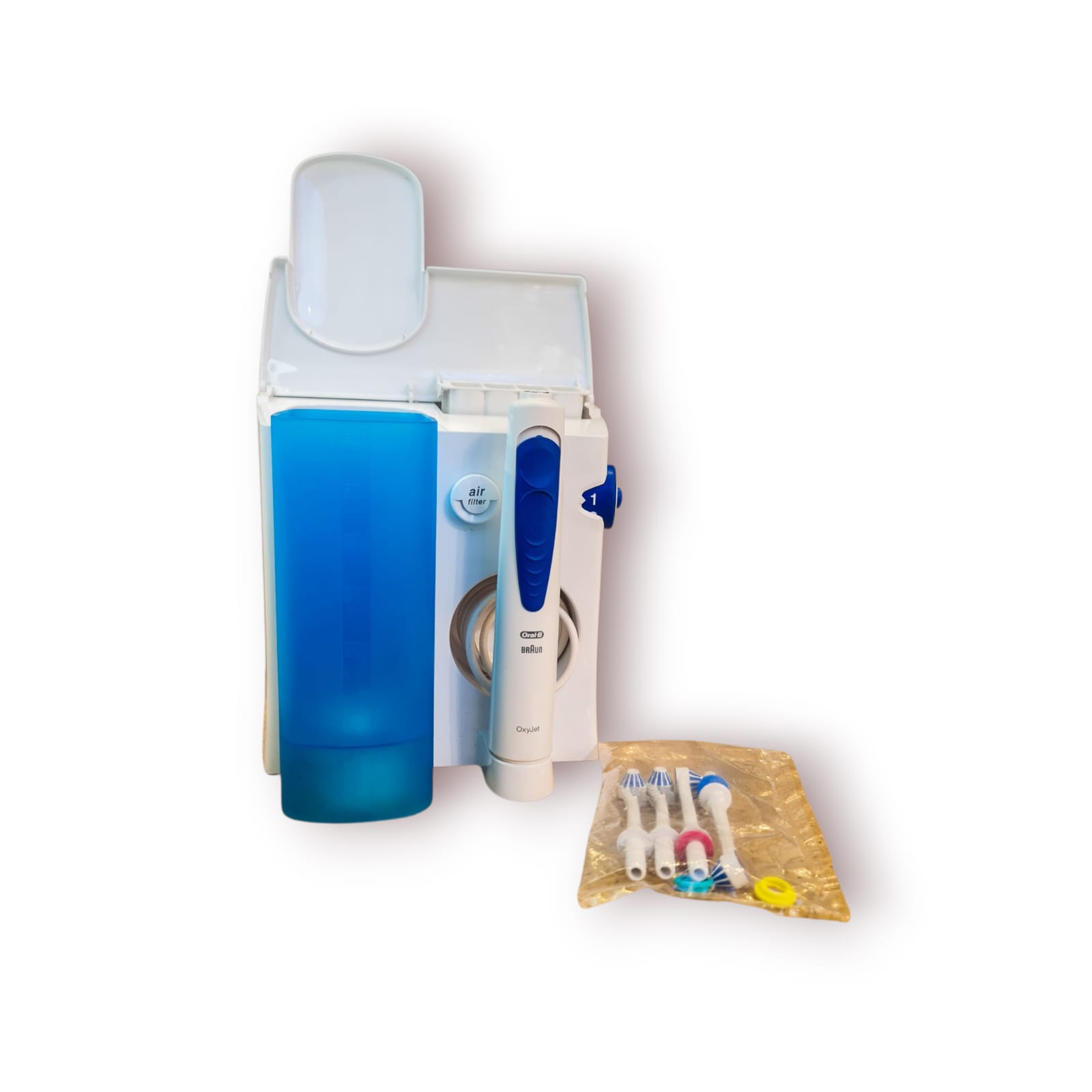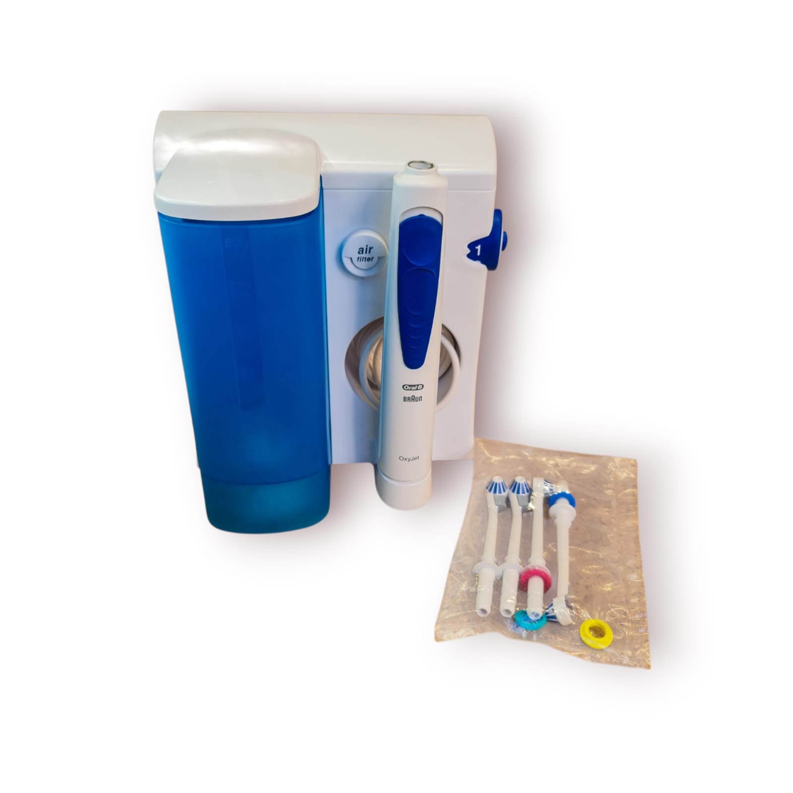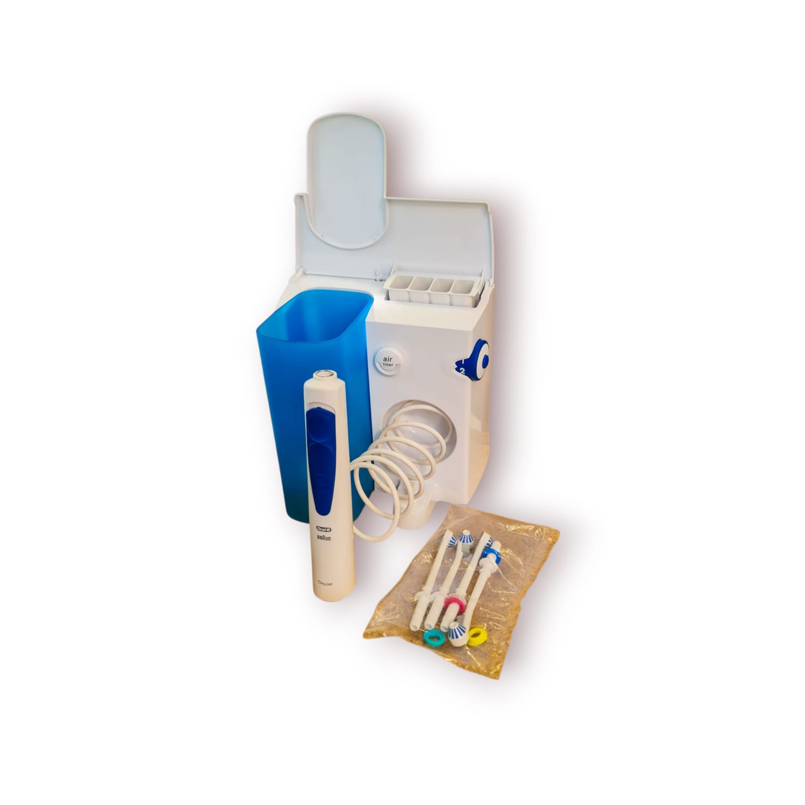 Sistema profissional de higiene oral da Oral-B/Braun, fabricado na Alemanha, que combina irrigador dentário OxyJet e escova elétrica num único aparelho. Indicado para cuidados completos da boca e gengivas, este modelo inclui reservatório de água, compartimento para cabeças de substituição e acessórios originais.
