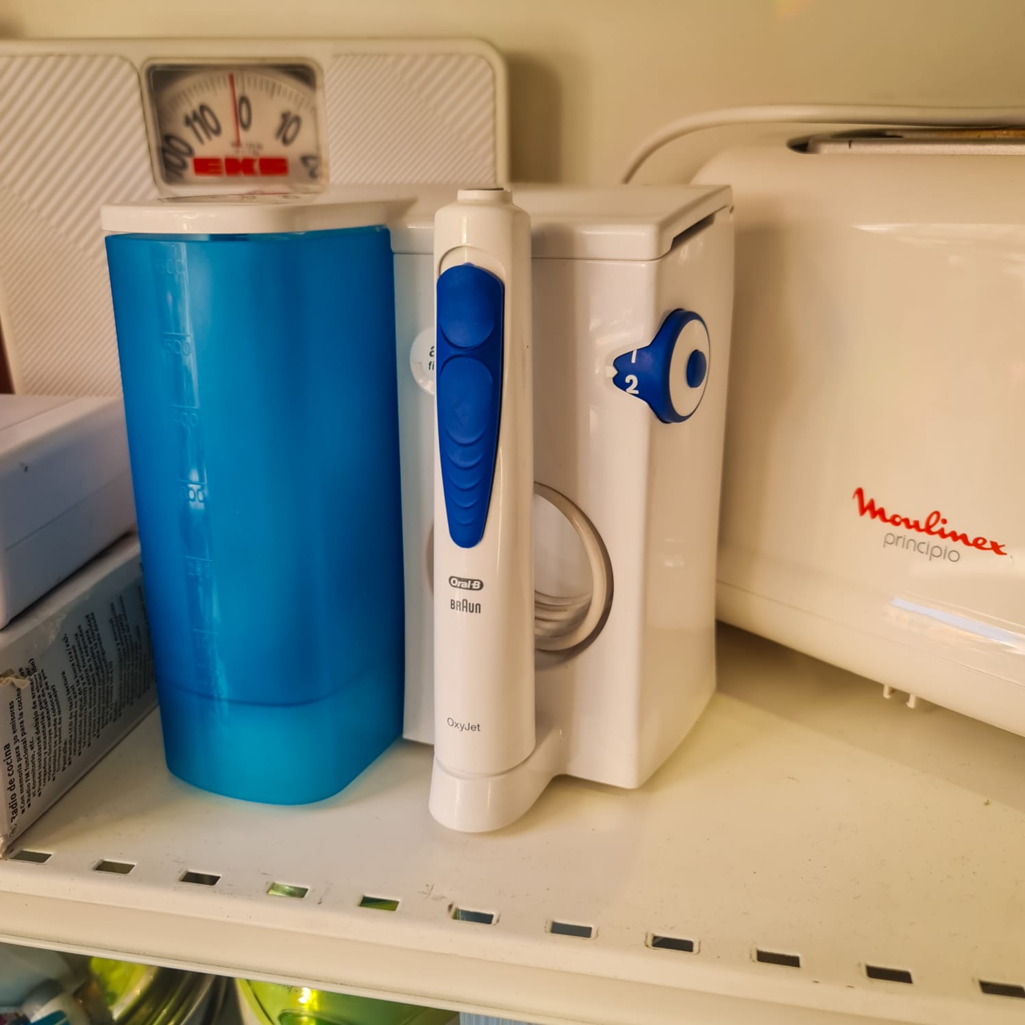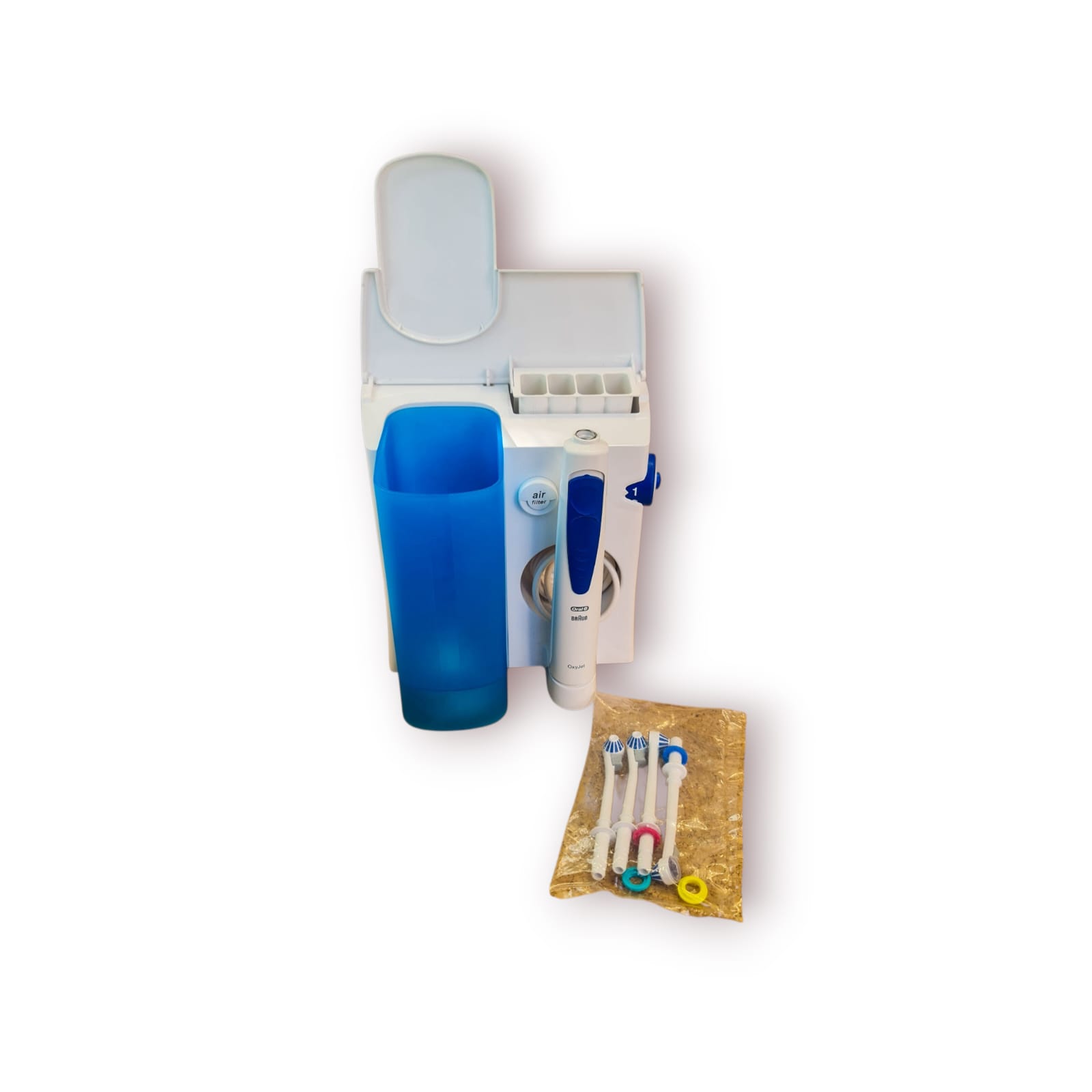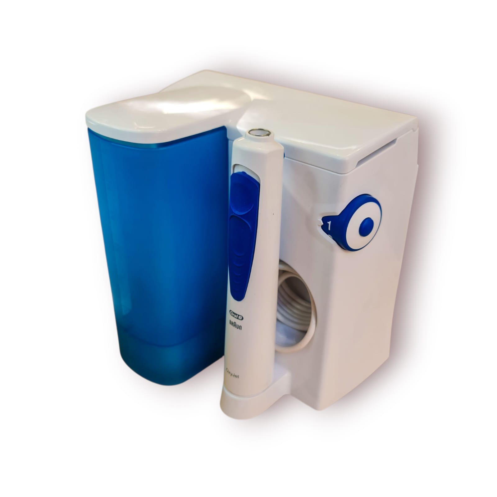Sistema profissional de higiene oral da Oral-B/Braun, fabricado na Alemanha, que combina irrigador dentário OxyJet e escova elétrica num único aparelho. Indicado para cuidados completos da boca e gengivas, este modelo inclui reservatório de água, compartimento para cabeças de substituição e acessórios originais.