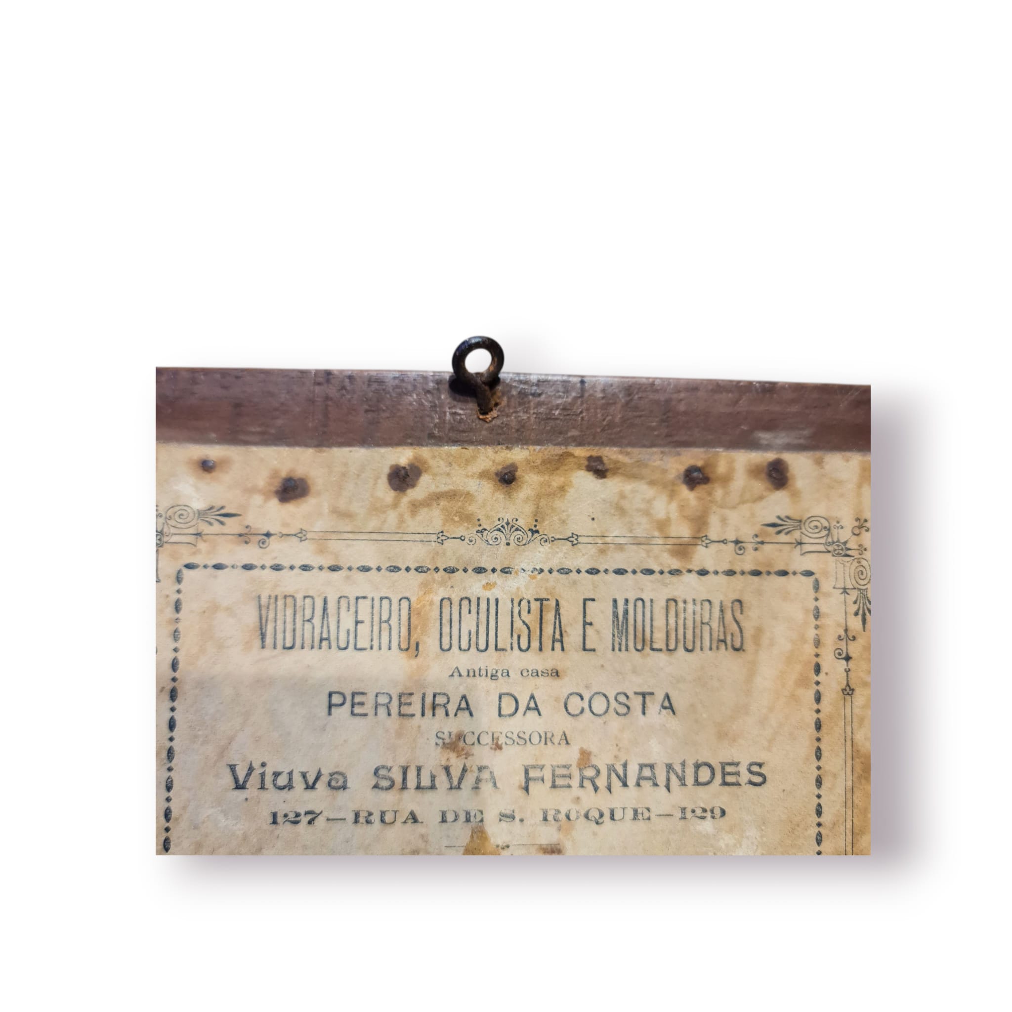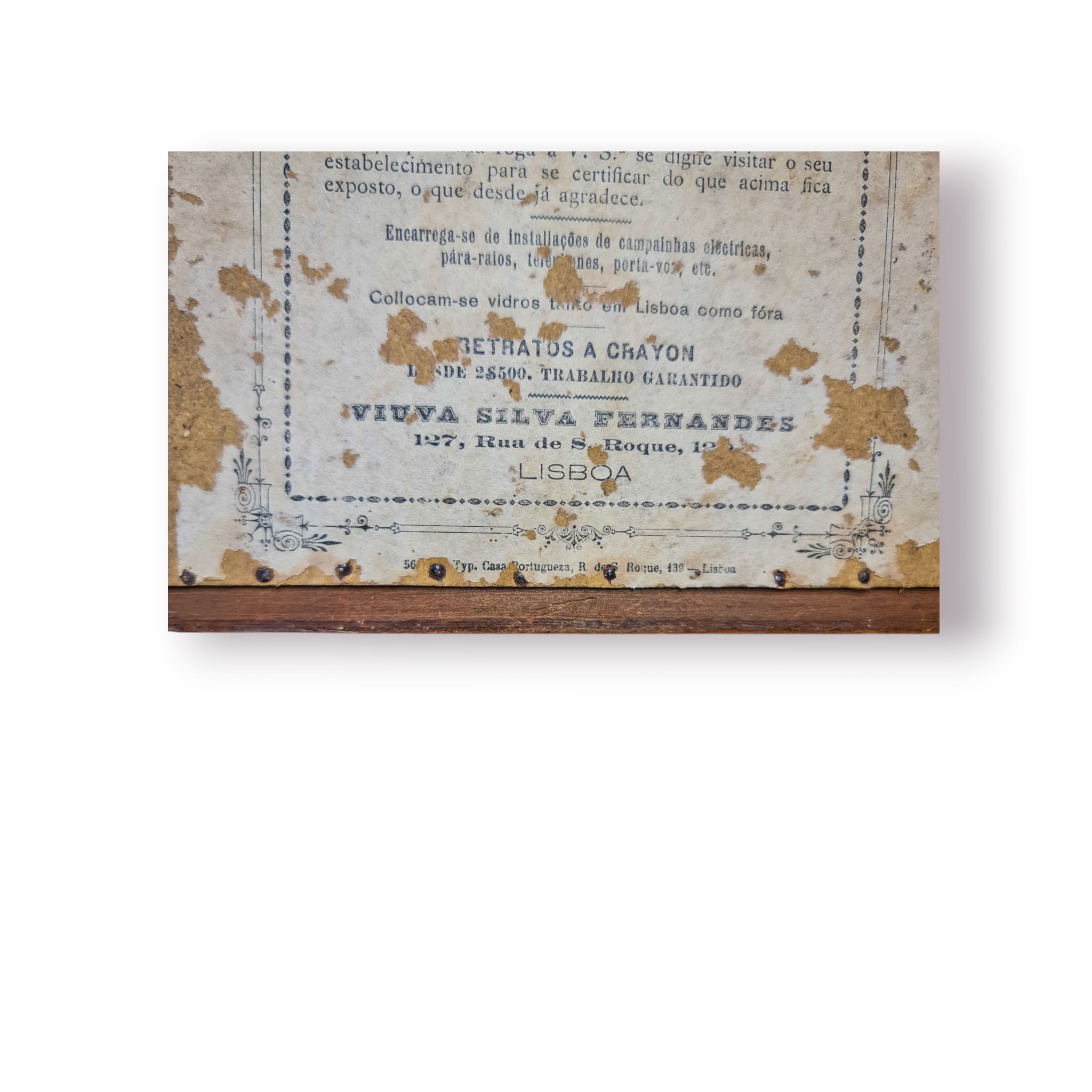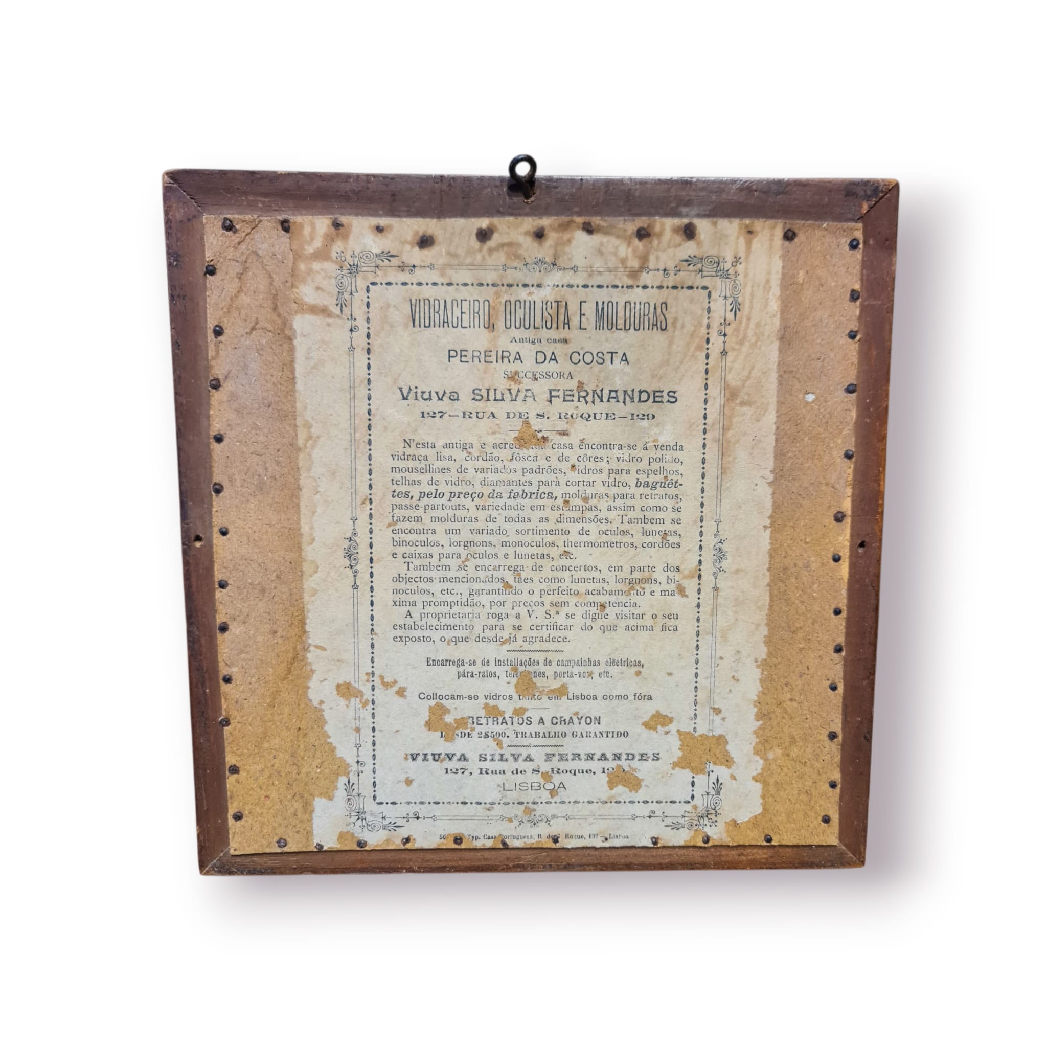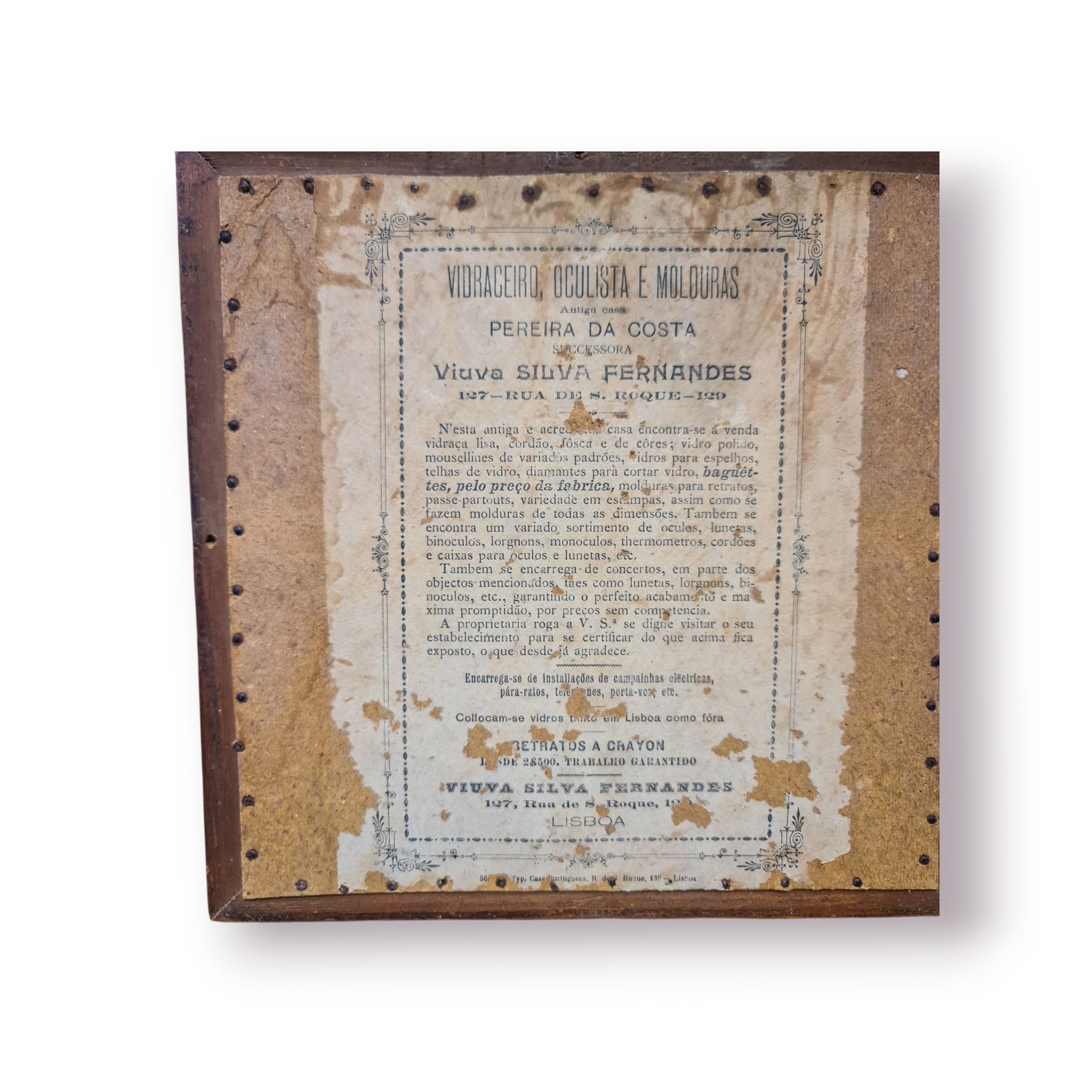 Montado em moldura de madeira original, o verso conserva o rótulo histórico da Casa Viuva Silva Fernandes, sucessora de Pereira da Costa, antigo vidraceiro e moldurista lisboeta (Rua de S. Roque, nº 127).