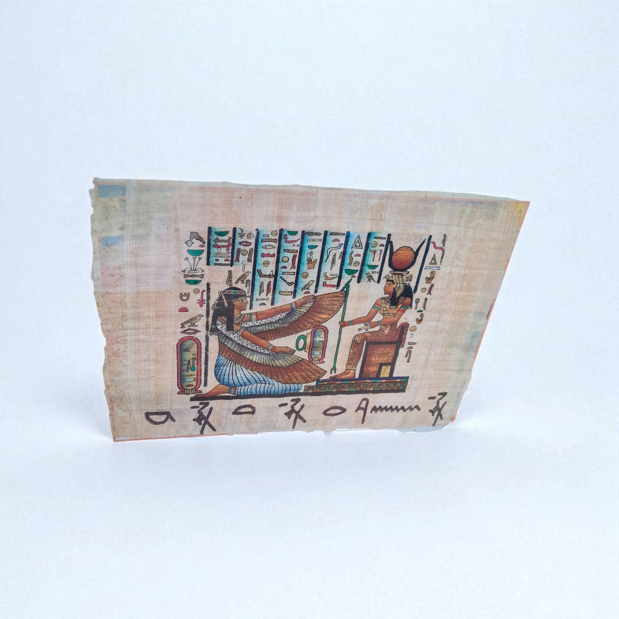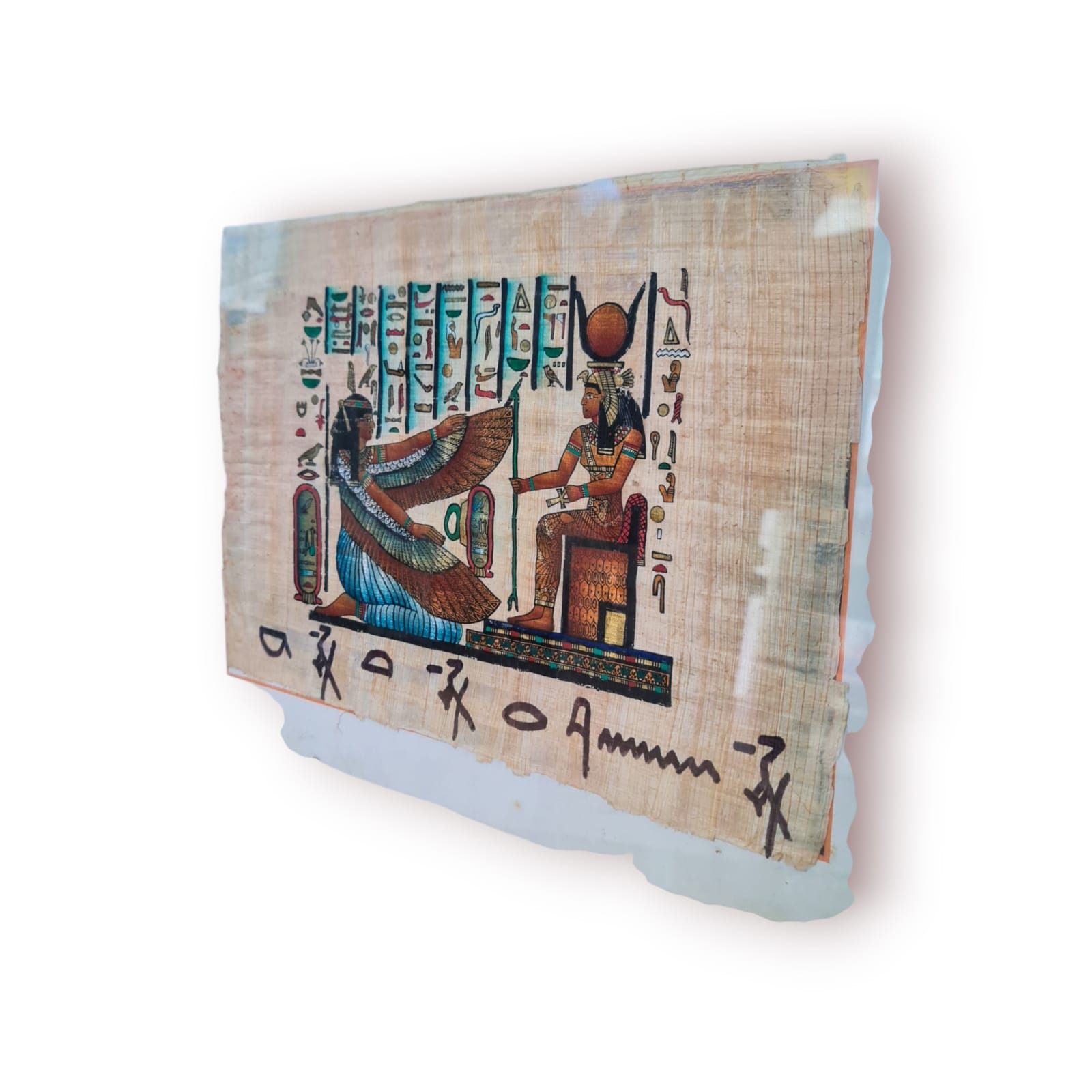 Bela pintura egípcia sobre papiro natural, representando uma cena simbólica da mitologia do Antigo Egito, com a deusa Ísis de asas abertas diante de Hathor (ou Nefertari).