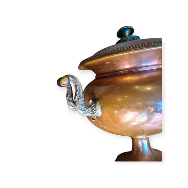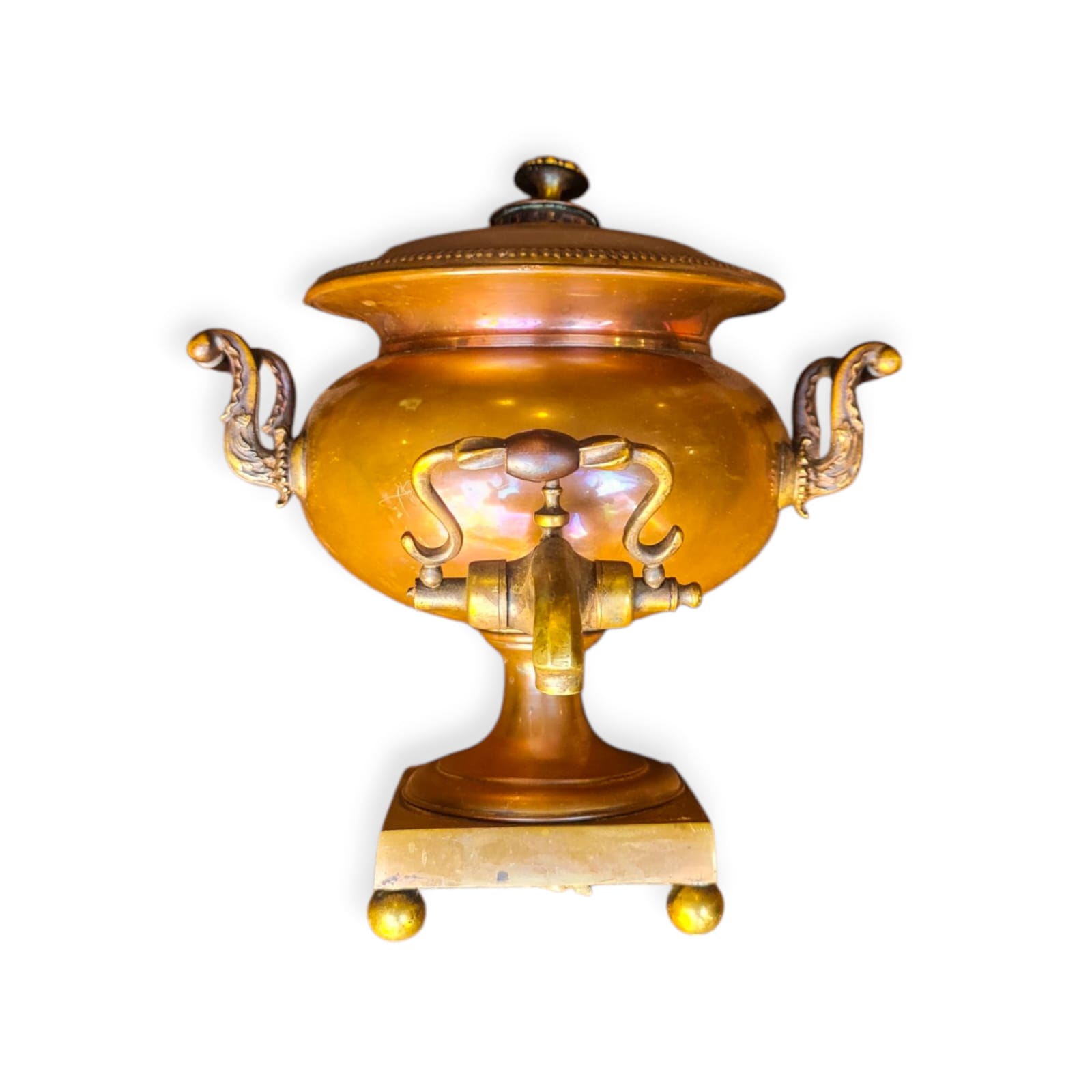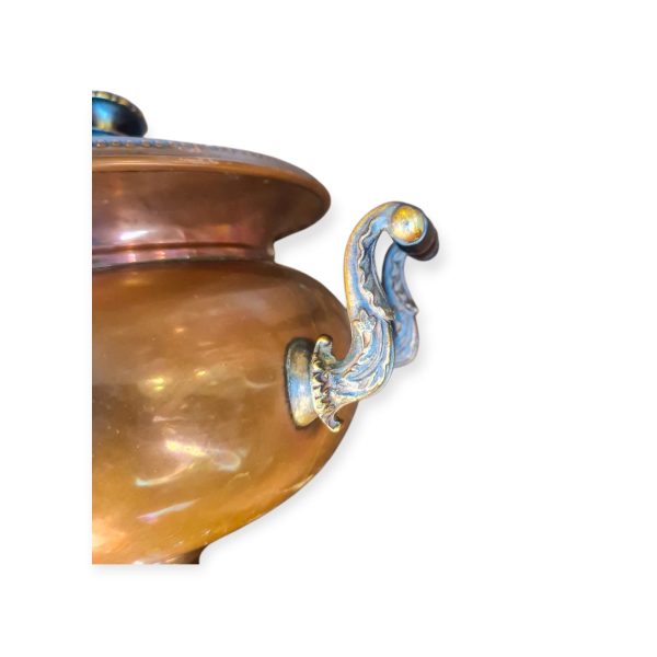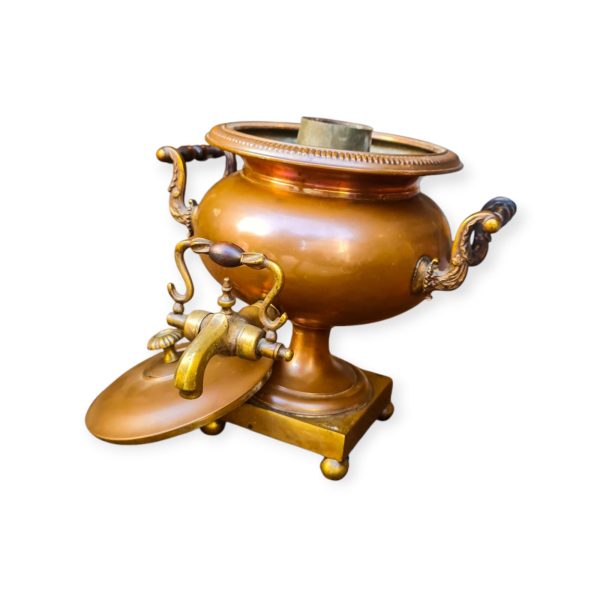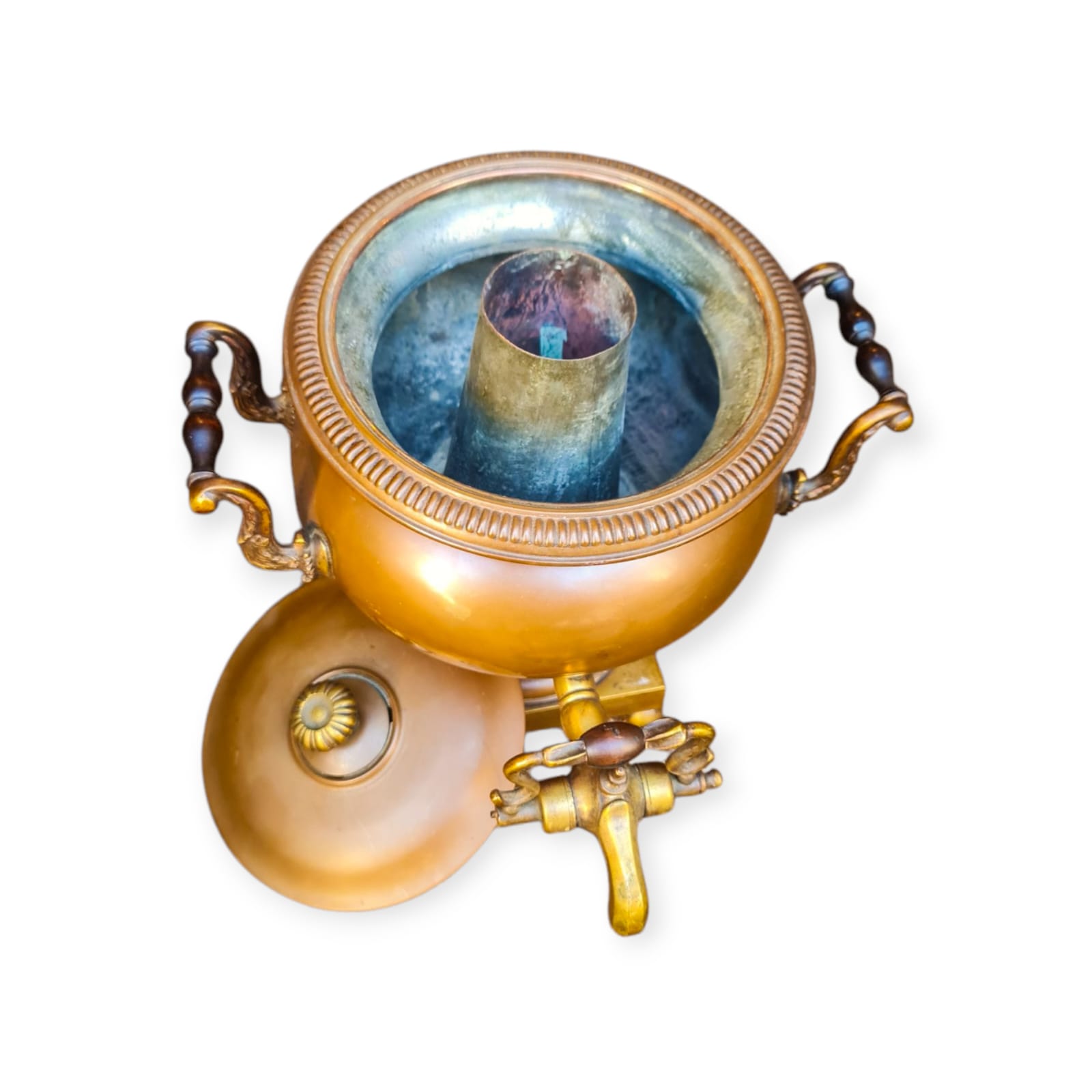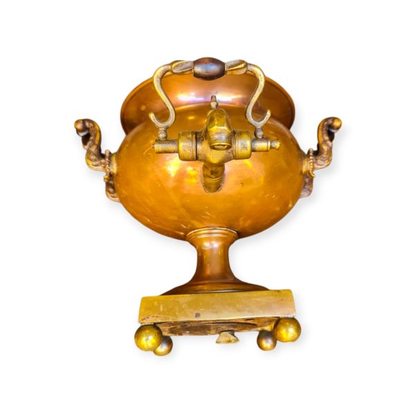 Alças laterais detalhadas e torneira decorativa funcional (aparentemente, estilo antigo)
