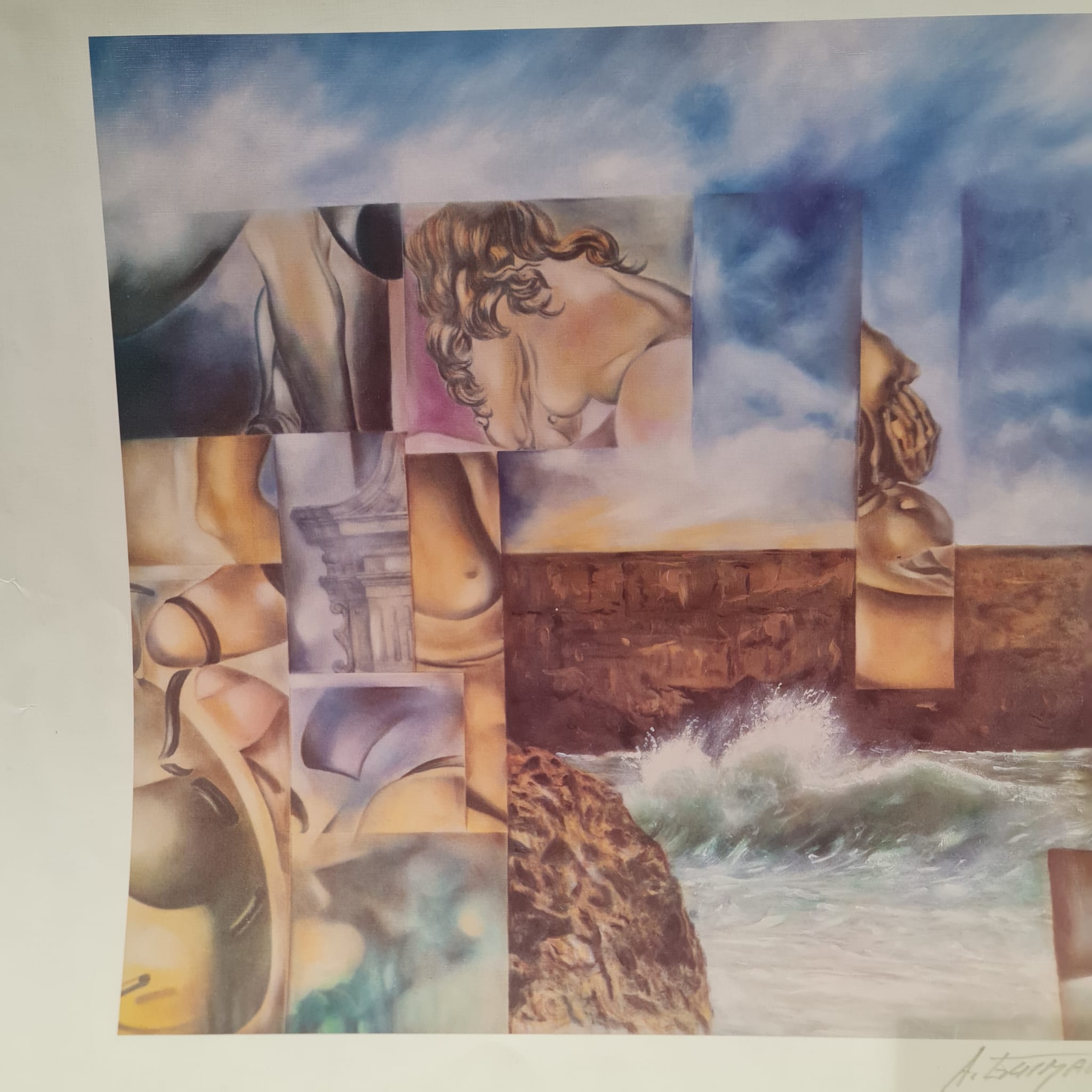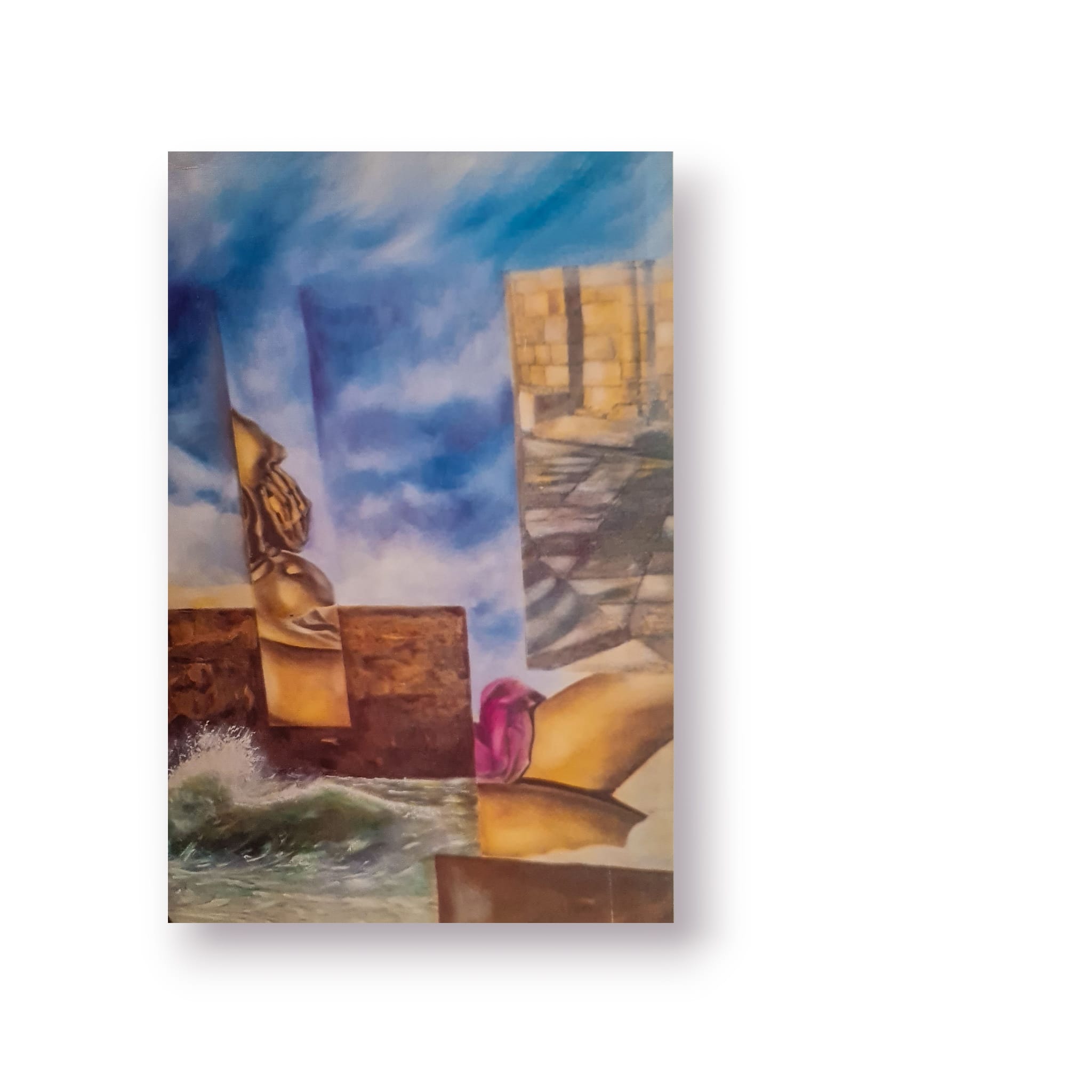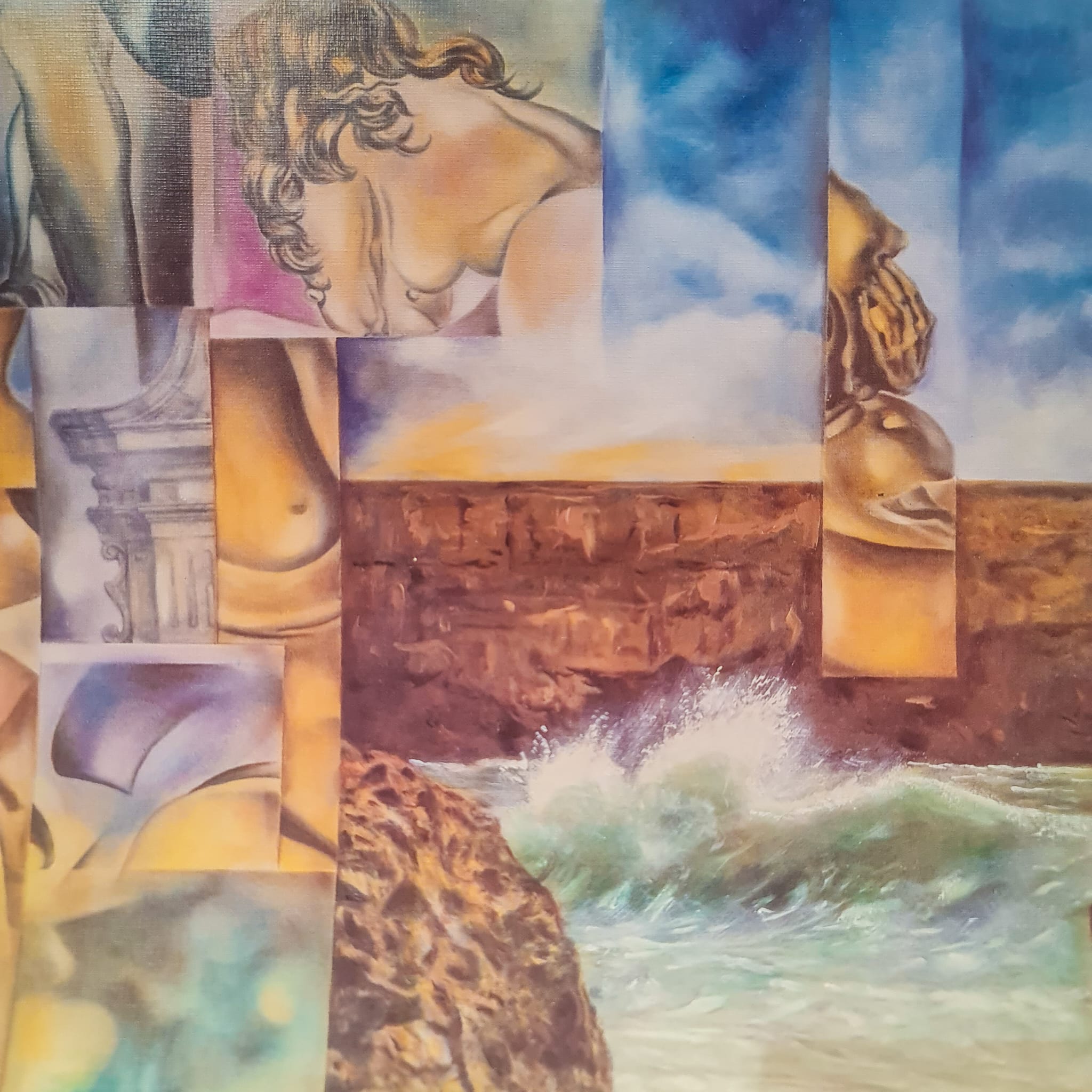 A composição mistura fragmentos de figuras femininas clássicas, colunas e mar agitado, criando uma cena de sonho entre o real e o simbólico — uma homenagem moderna ao surrealismo.