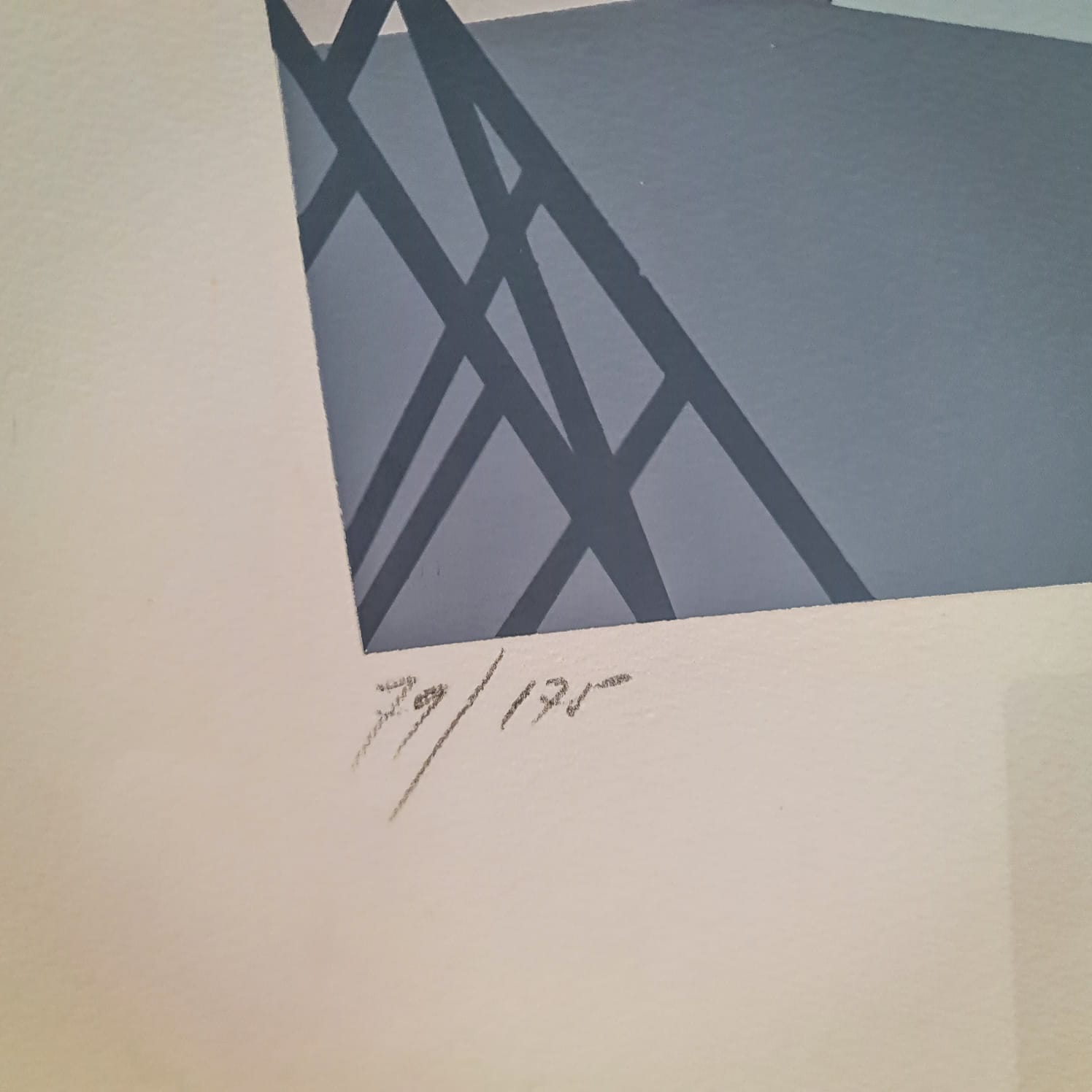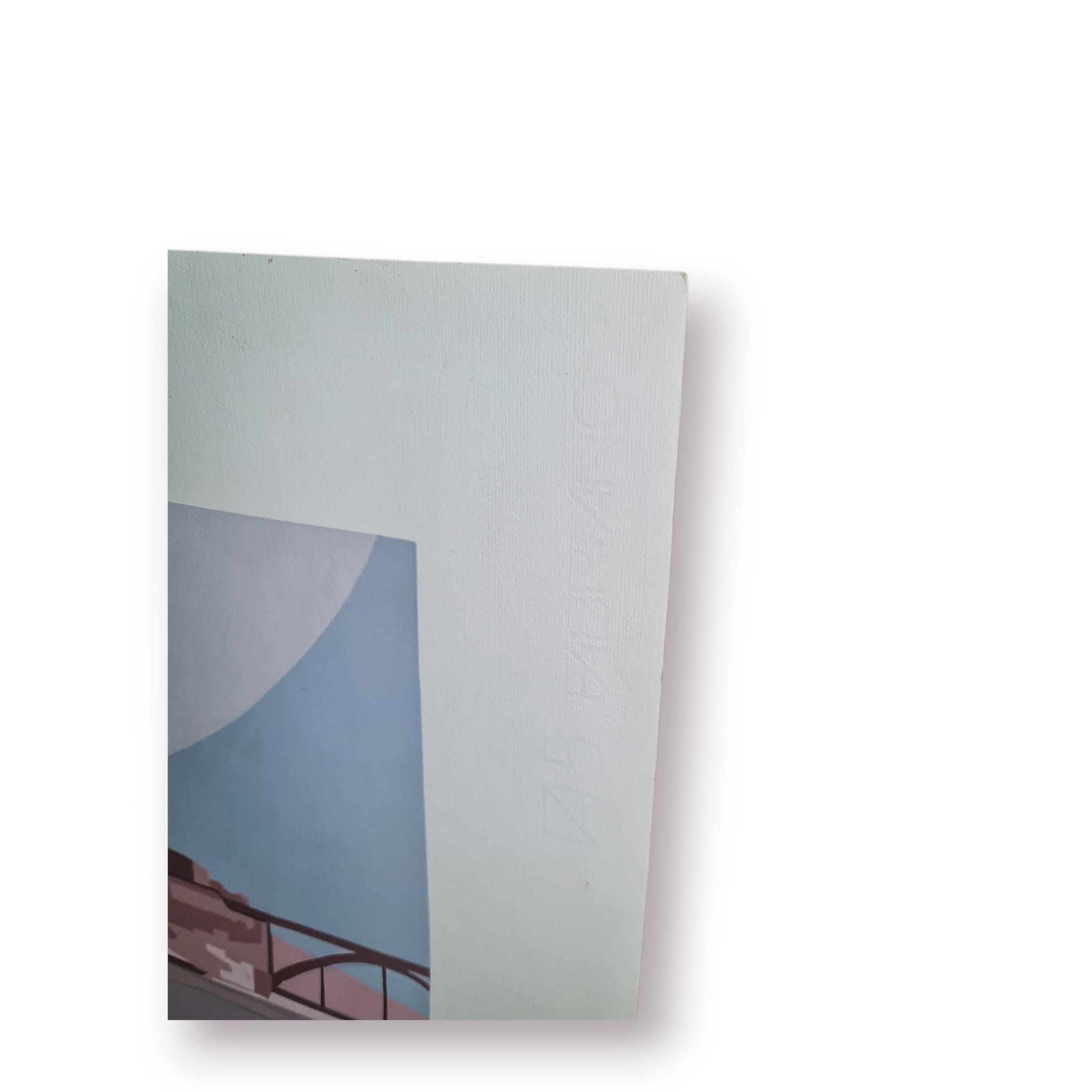 Serigrafia original de Zé Penicheiro, datada de 1993, representando uma vista estilizada do Douro num estilo geométrico e suave, característico do artista. Impressa em papel de arte com relevo e margem marcada, esta peça pertence à edição limitada 79/175, numerada e assinada pelo artista.