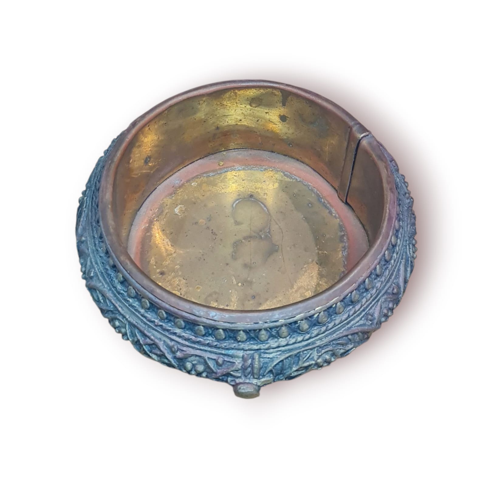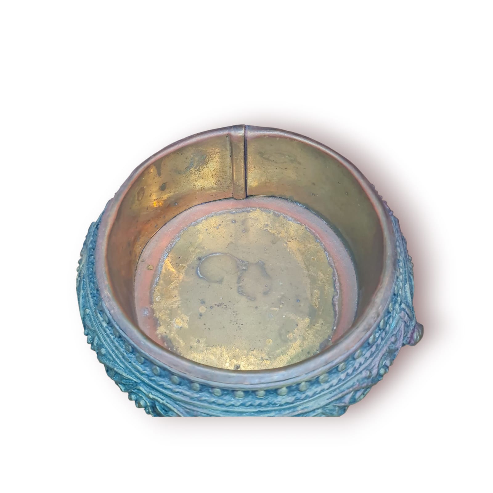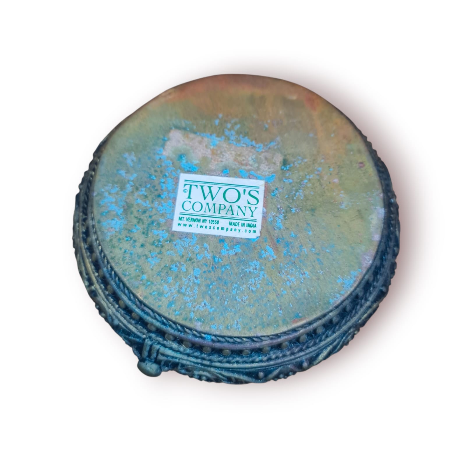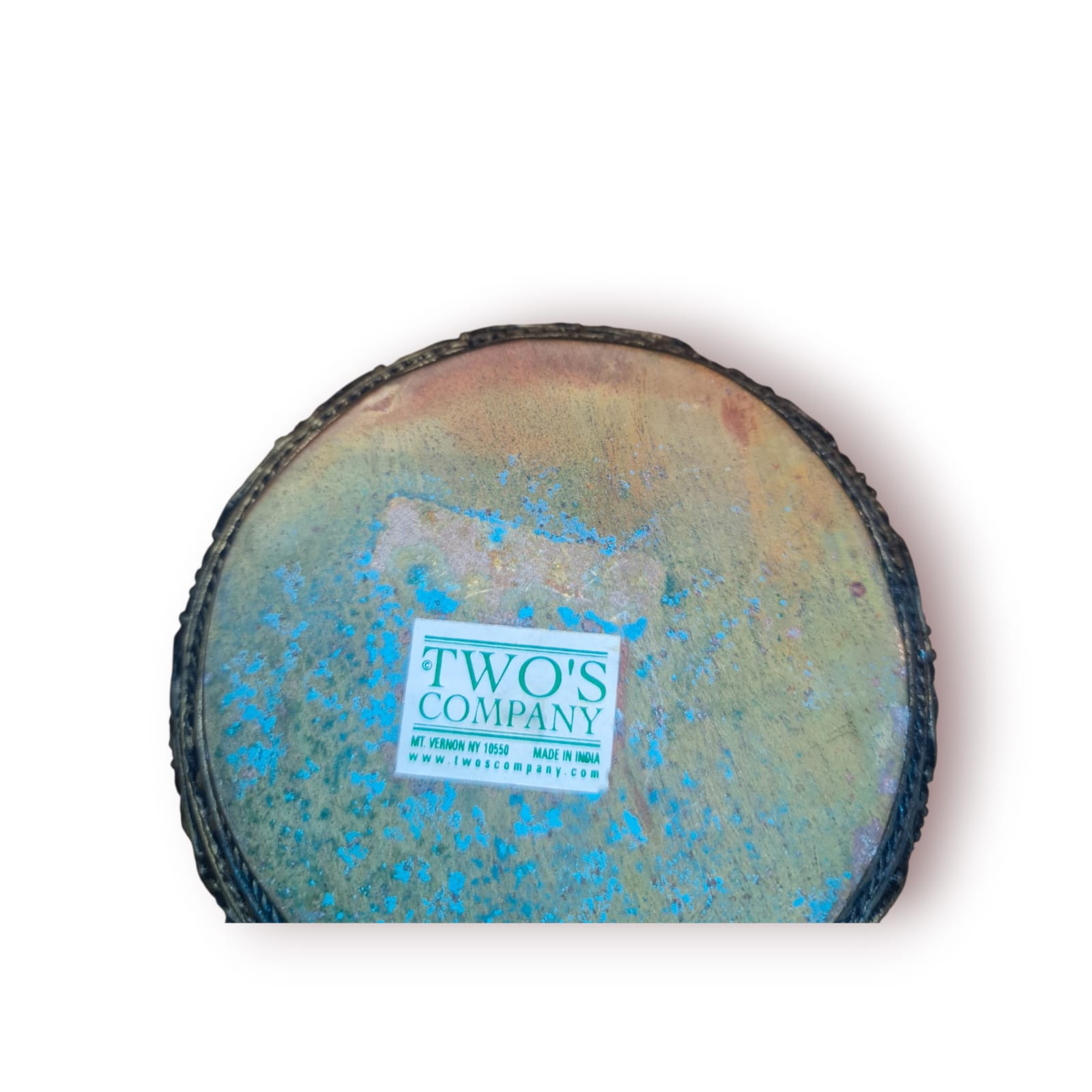 Peça artesanal de origem indiana, produzida em bronze maciço e assinada pela marca Two’s Company (Mount Vernon, NY). Apresenta delicados relevos florais e frisos pontilhados em toda a circunferência, com pátina azul-esverdeada natural que realça o seu caráter exótico e envelhecido.