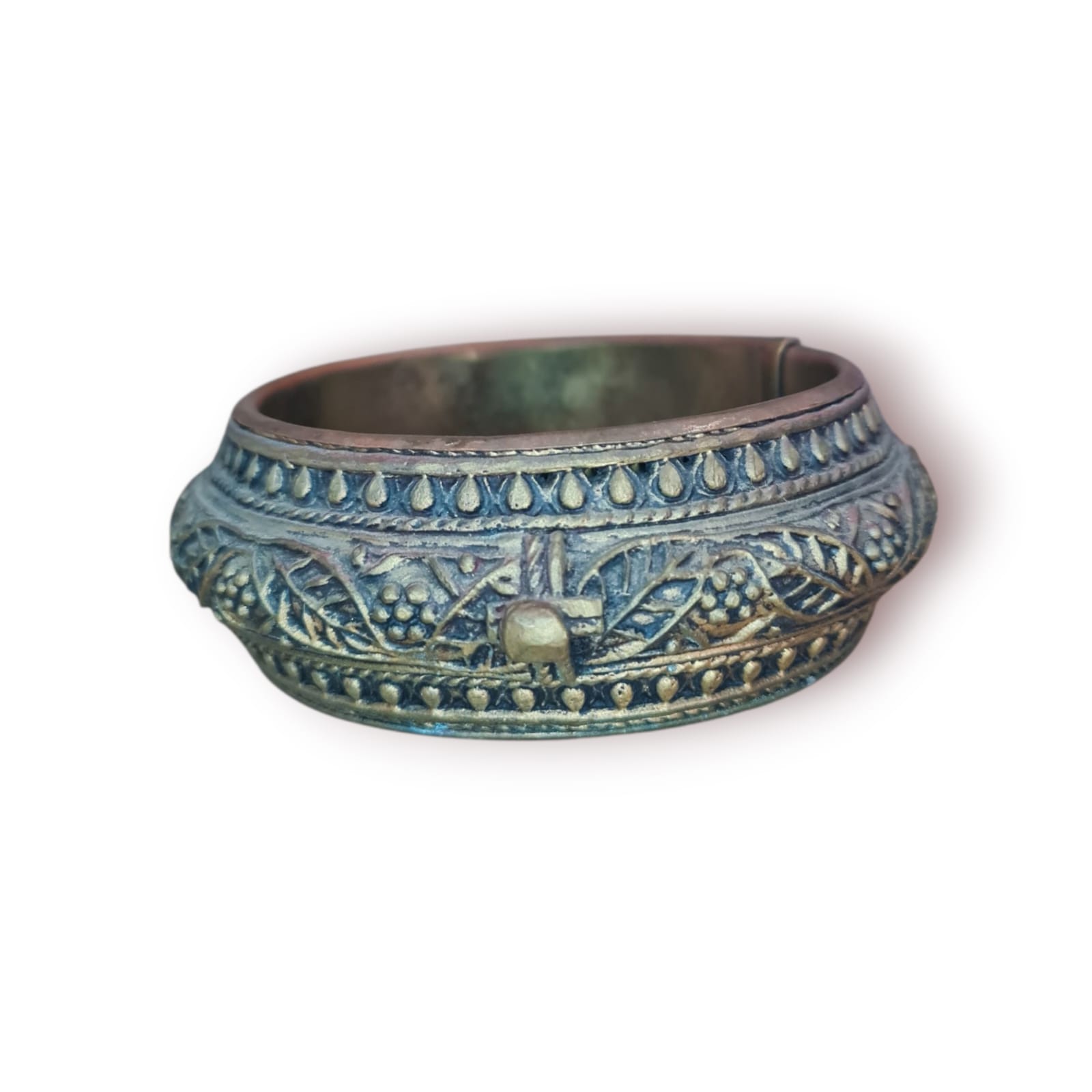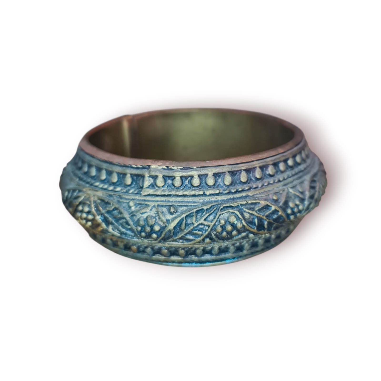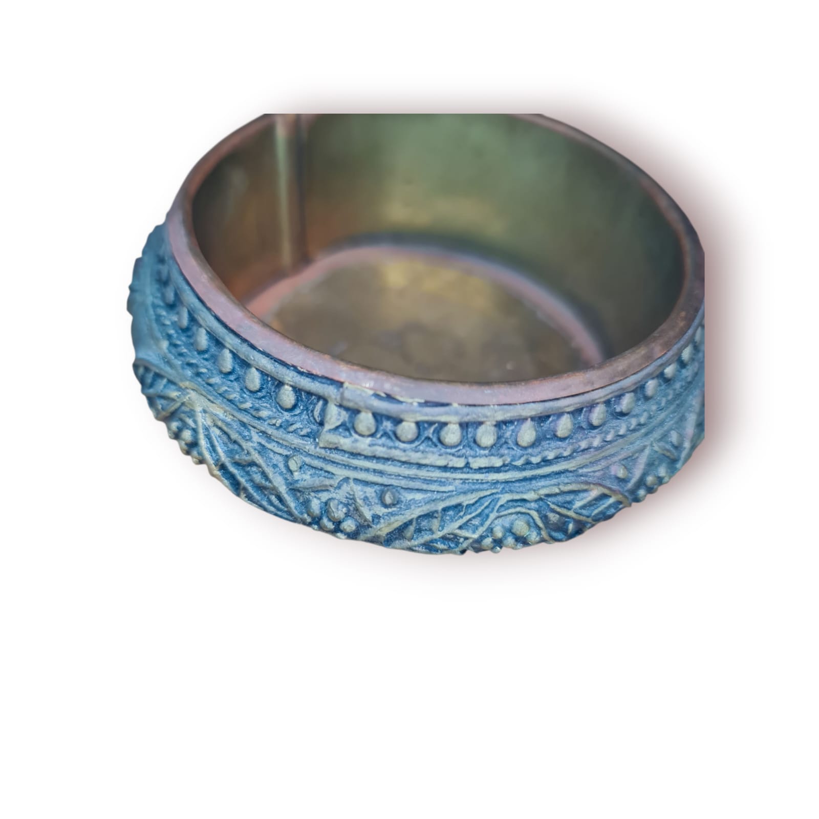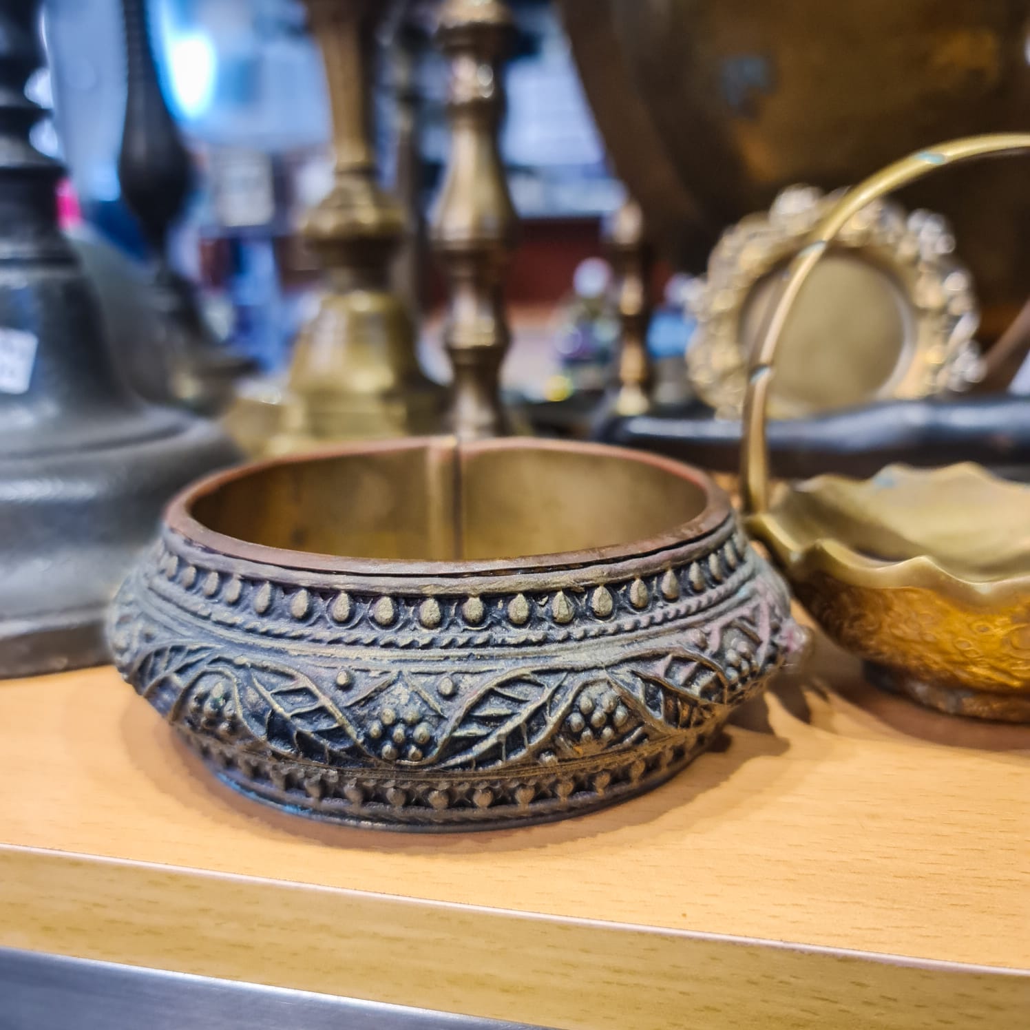Peça artesanal de origem indiana, produzida em bronze maciço e assinada pela marca Two’s Company (Mount Vernon, NY). Apresenta delicados relevos florais e frisos pontilhados em toda a circunferência, com pátina azul-esverdeada natural que realça o seu caráter exótico e envelhecido.